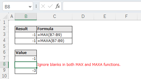 Comparison of MAX and MAXA functions: cells where the formula results in a blank cell.