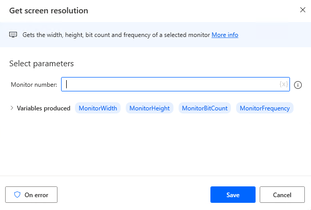 Drag "Get screen resolution" from "Workstation" under "Actions".